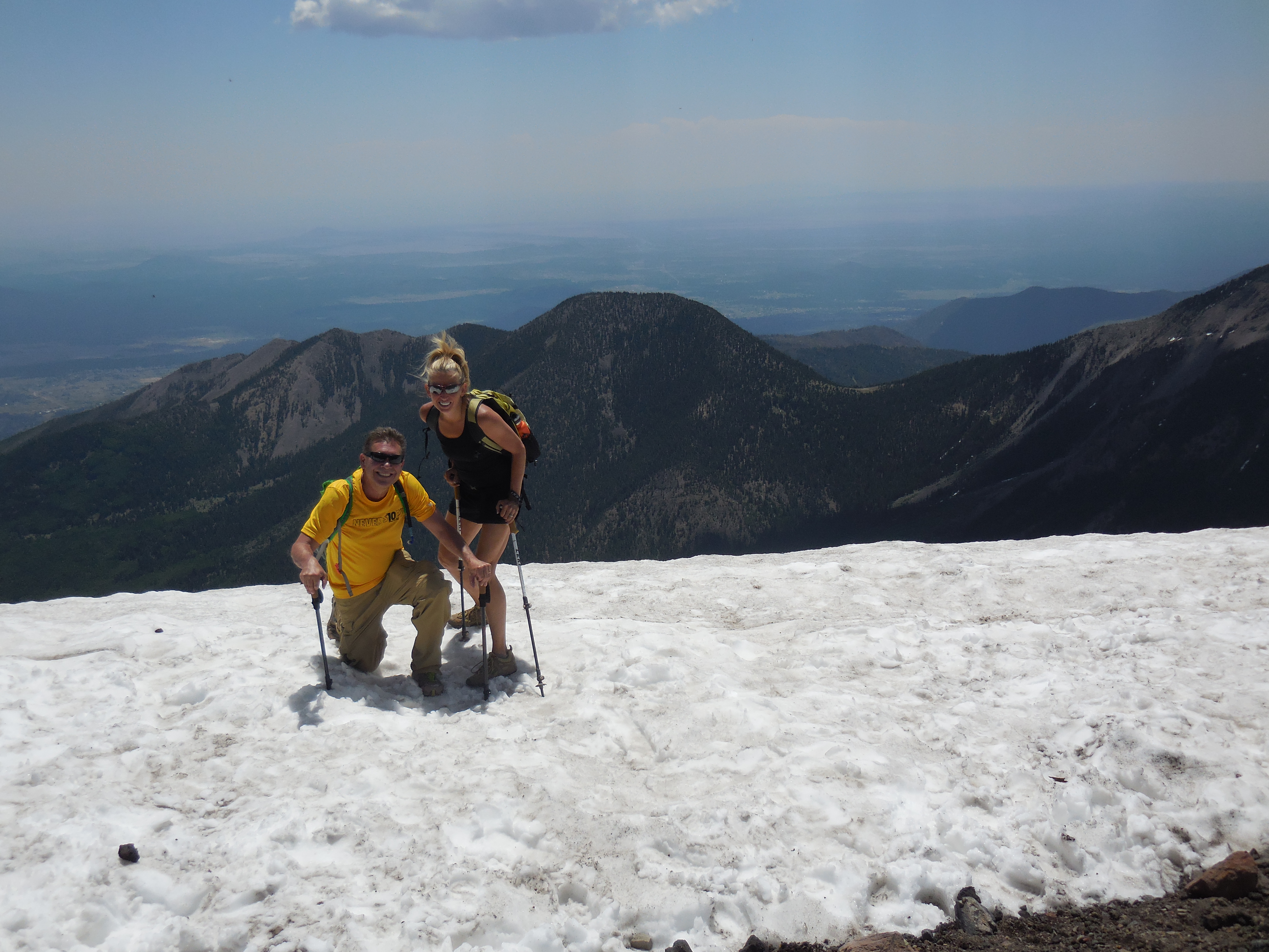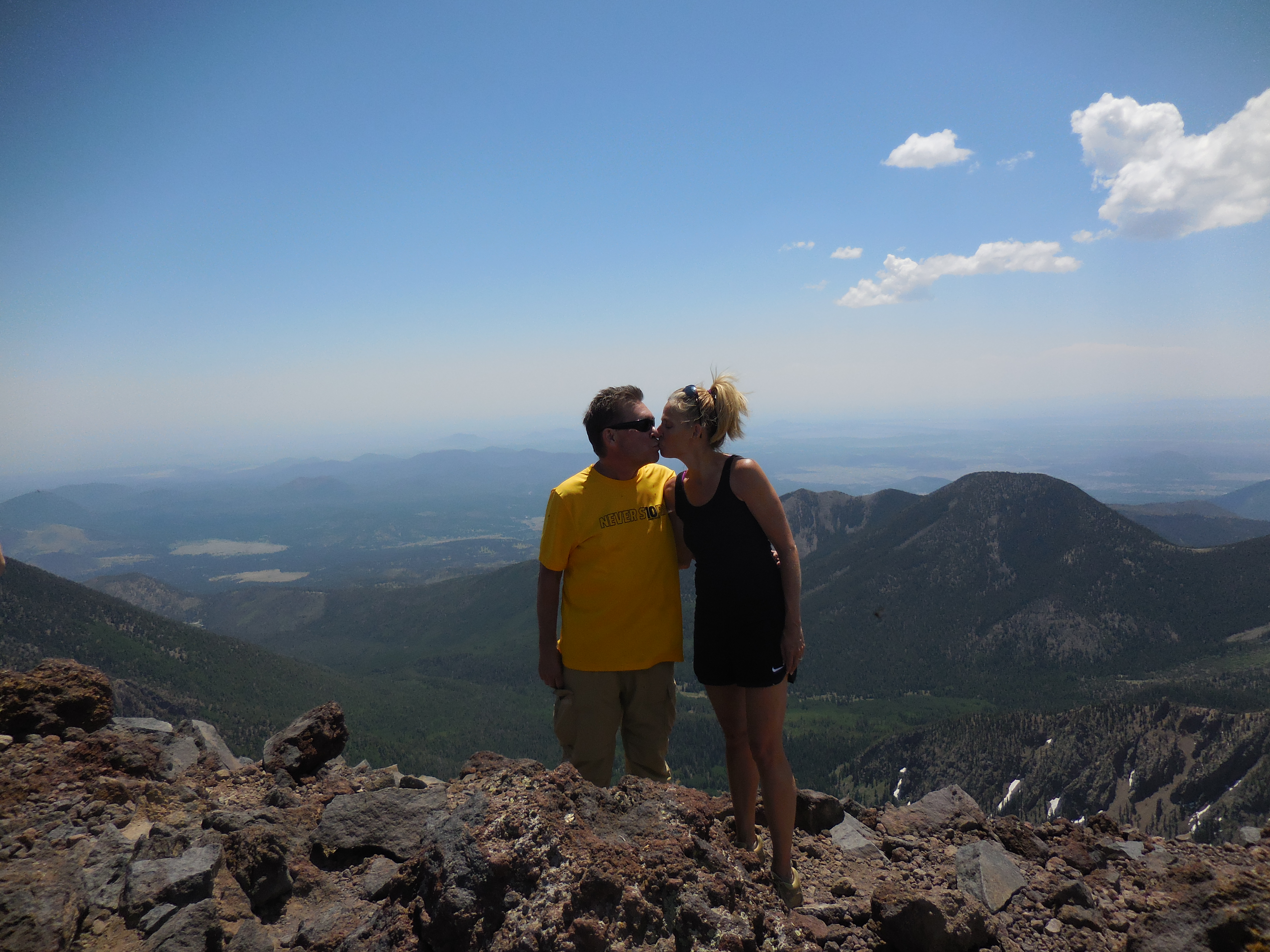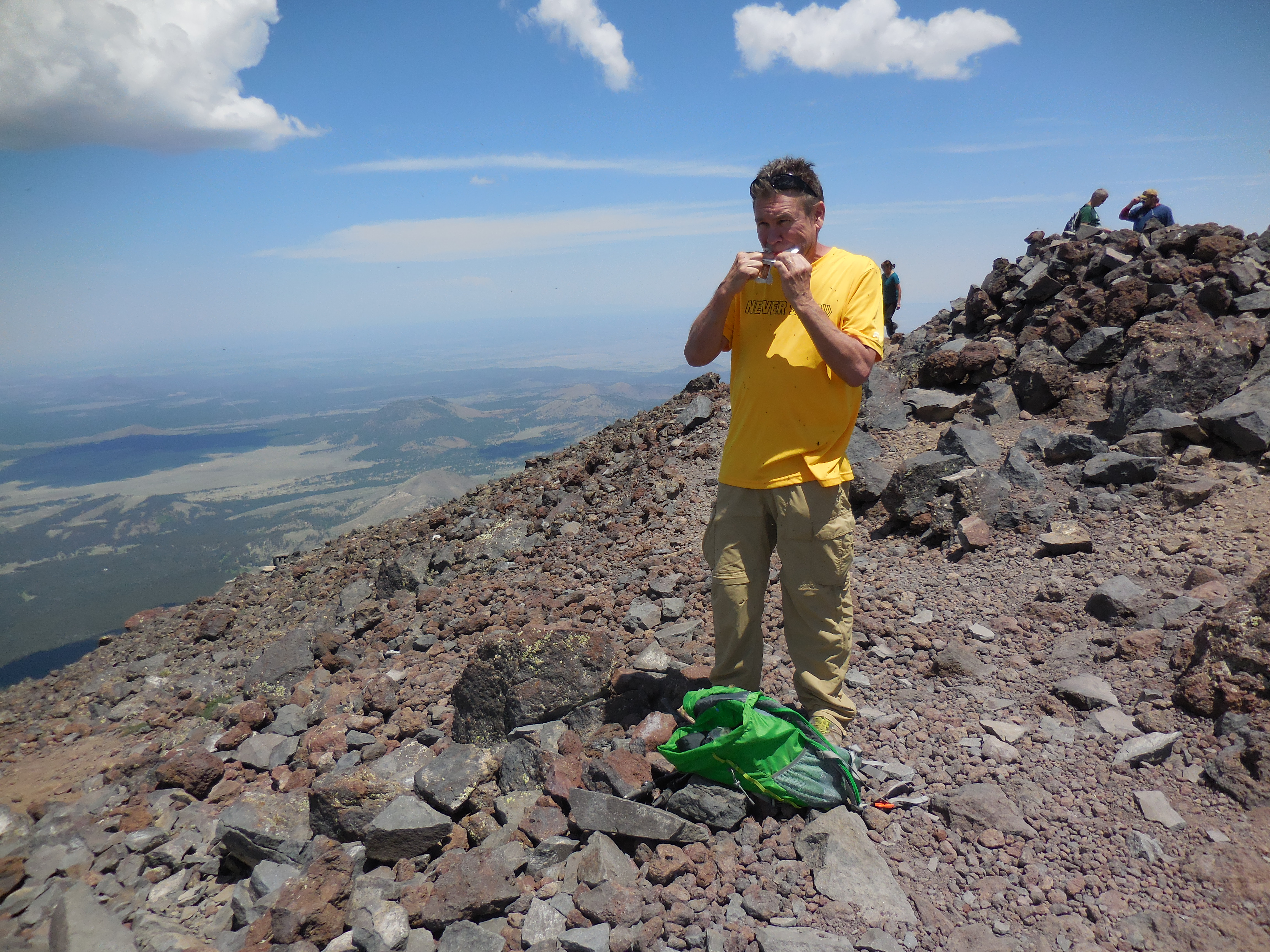 We get on the trail around 8:00 and pass many hikers on the way to the summit. We get to the inner basin and I’m thinking that it can’t be much more and then the real climb begins. Even though the journey’s long, and I know the road is hard, well, the one who’s gone before me, He will help me carry on. The trail is much steeper and rougher. Up and up we go and we arrive around 11:00. On the way up we pass Craig and Mary McMullen, fellow Paysonites, on their way down. We have climbed over rocks, ascended two false peaks and finally the last part is straight up. But it is absolutely worth the effort. The views are spectacular even with the dirty air across AZ. There are flying bugs everywhere. I have yet to figure out why there are so many bugs at 12,600+ feet.