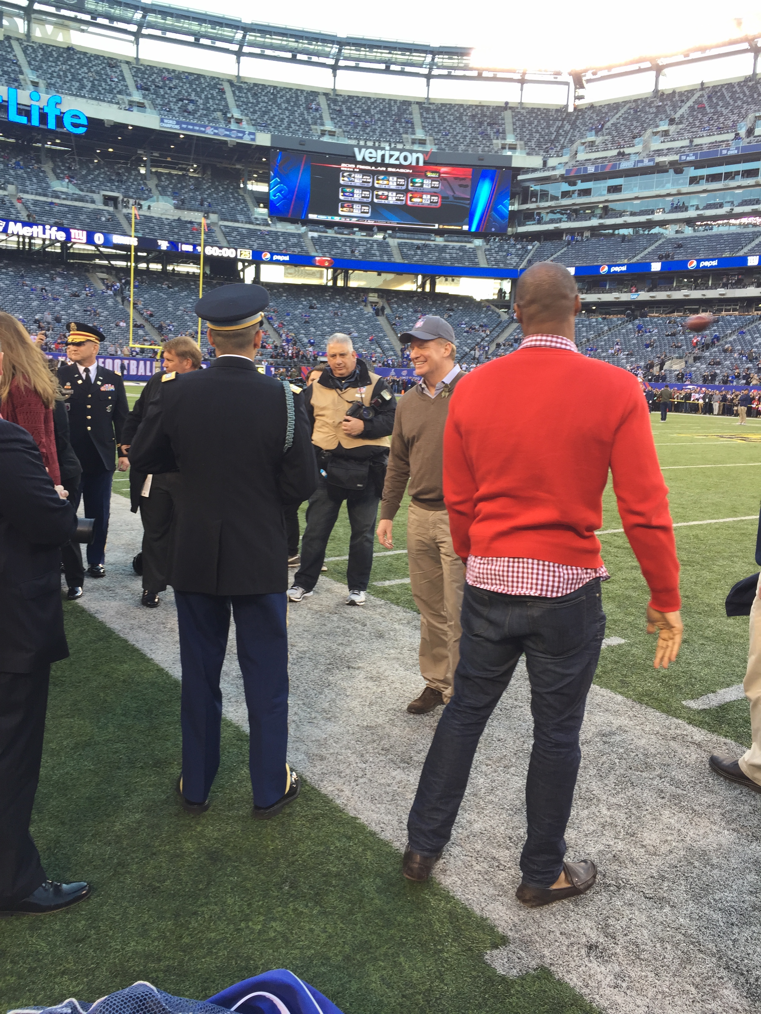 Football sight seeing has now gone to another level. As we enter the Giants sideline area, Kevin is just casually talking with some pretty big shot type of people. Once again I get to meet a former Giant, Harry Carson, a great Hall of Fame linebacker from back in the day. He tells us he has just returned from the Phoenix area and a conference on concussions. What a nice man. Kevin says “hey, you remember Plaxico Burress? Yep. Well your standing next to him.” You might remember him more for accidentally shooting himself in the leg at a nightclub while carrying a concealed weapon illegally in NYC. I thought about saying something but chose to remain silent. You see, I can use good judgment at times.