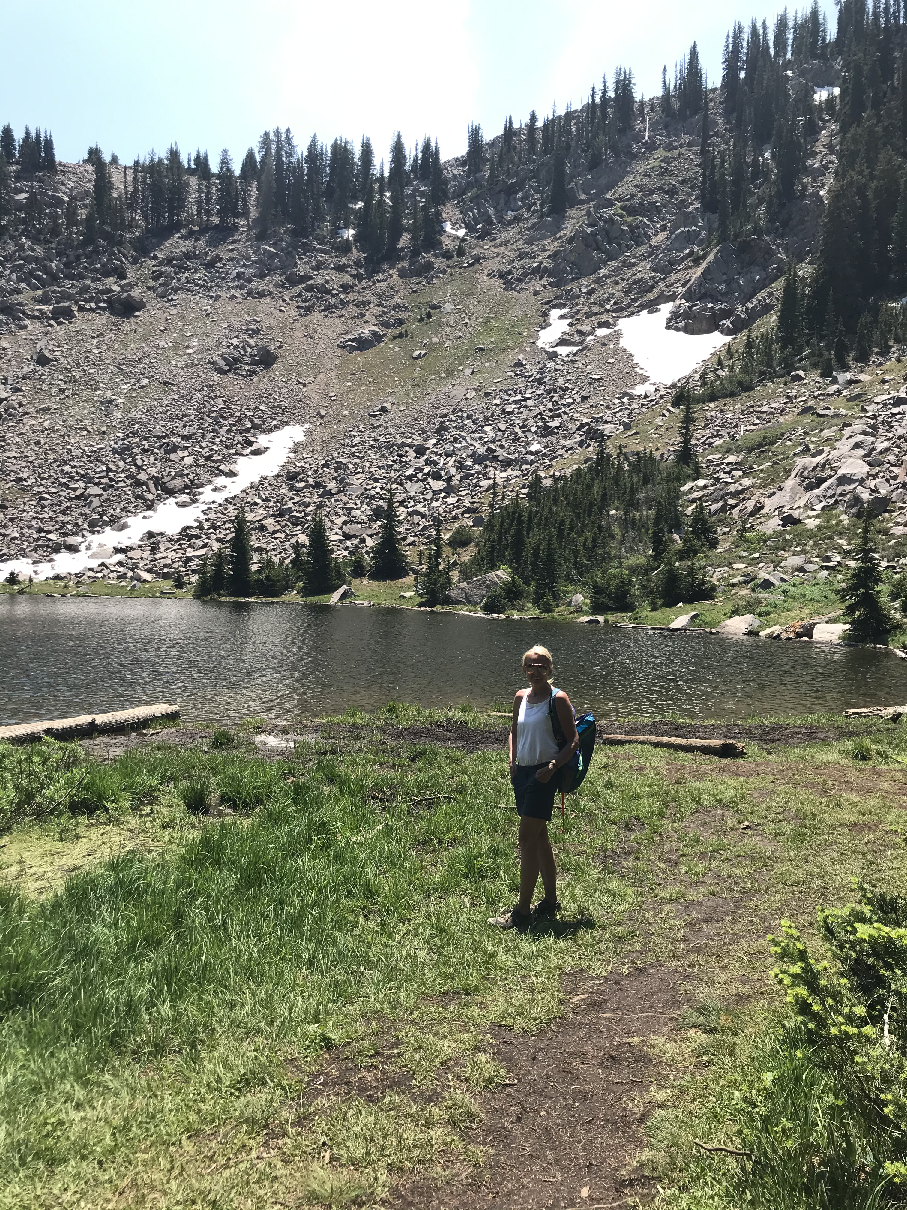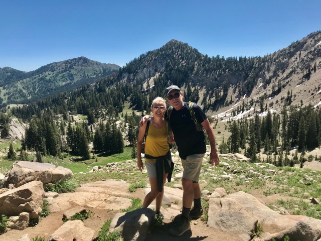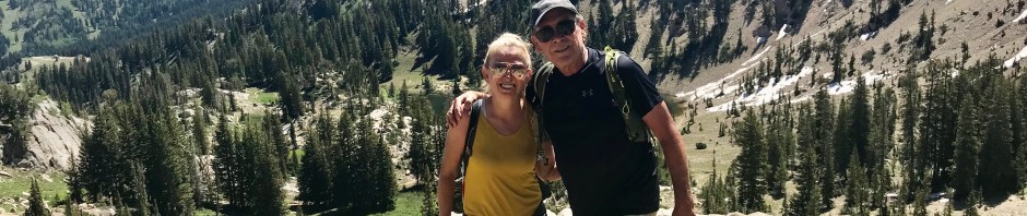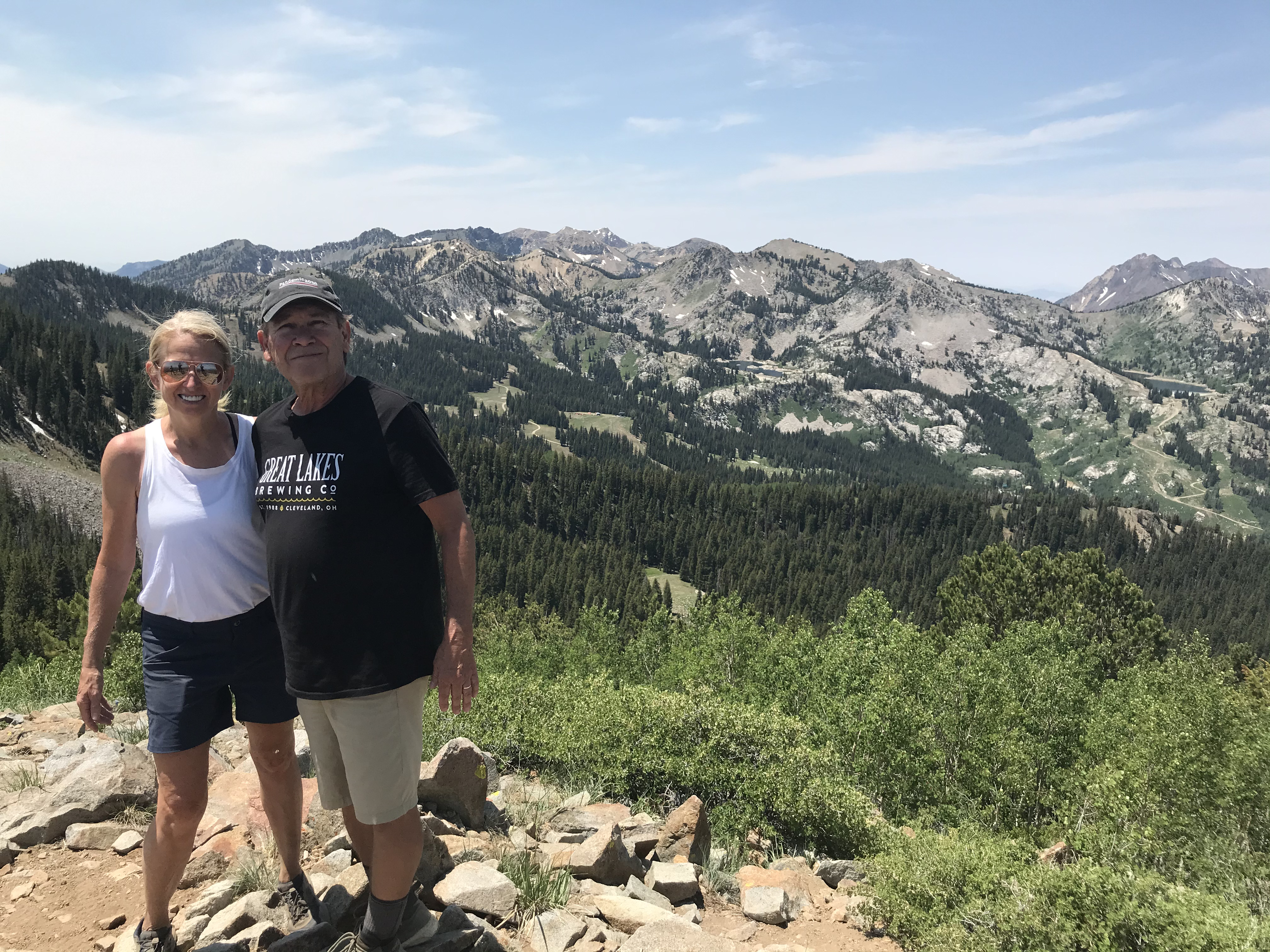 Tuesday morning has arrived and after breakfast and more coffee at Silver King, we check out of the Doubletree and head back into the mountains for more hiking and more adventure. It is sunny and hot by Park City standards when we begin our trek to the 10420 Peak. Parking is at the Bloods Lake Trailhead. There are plenty of cars and plenty of hikers on the first part of our journey that takes us to Bloods Lake after 1.5 miles. This is a beautiful mountain lake with many people that hike to this area. After our time at the lake we get back on our trek to 10420 Peak. Carolyn and I decided on 10420 instead of the close by Clayton Peak that is about 200 feet higher but more of a rocky climb over a longer stretch. The trail is over rocks and it is a bit of a scramble but nothing that I would consider hard or real dangerous. At the top, the views are fantastic. One can look in all directions to get great views of area lakes and other peaks. We were joined at the summit by a couple from Ogden Utah who were avid hikers. Most hikers are very friendly and fun to talk with. We were able to get some pictures together and took their picture as well.