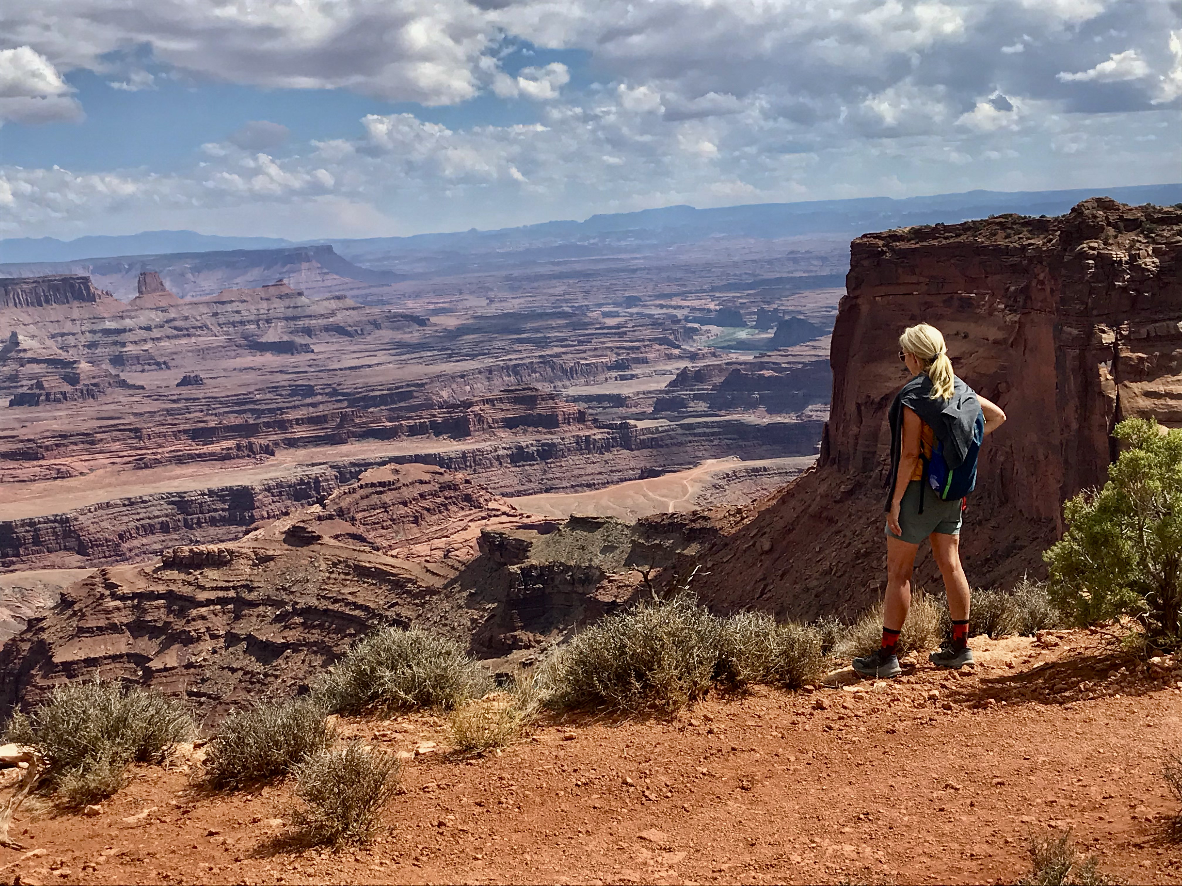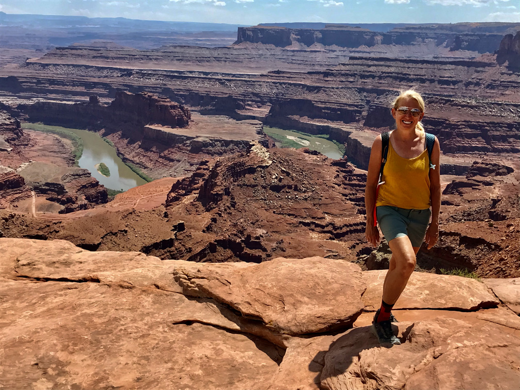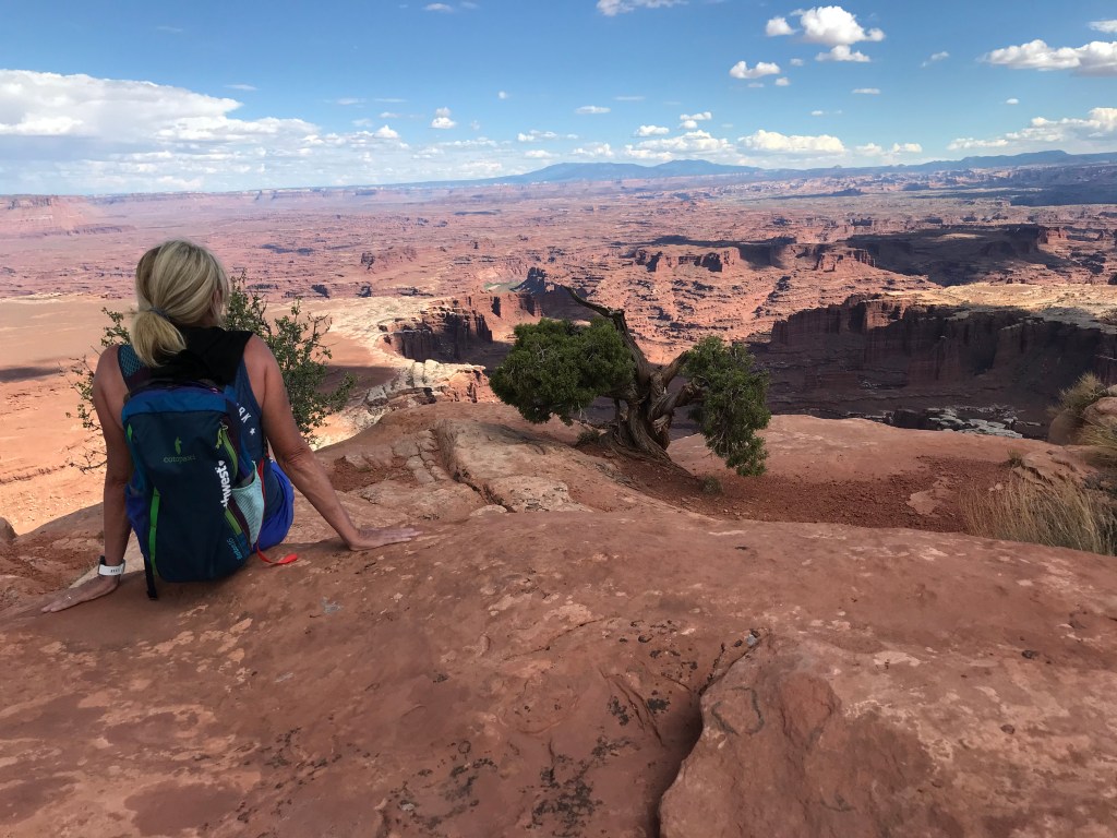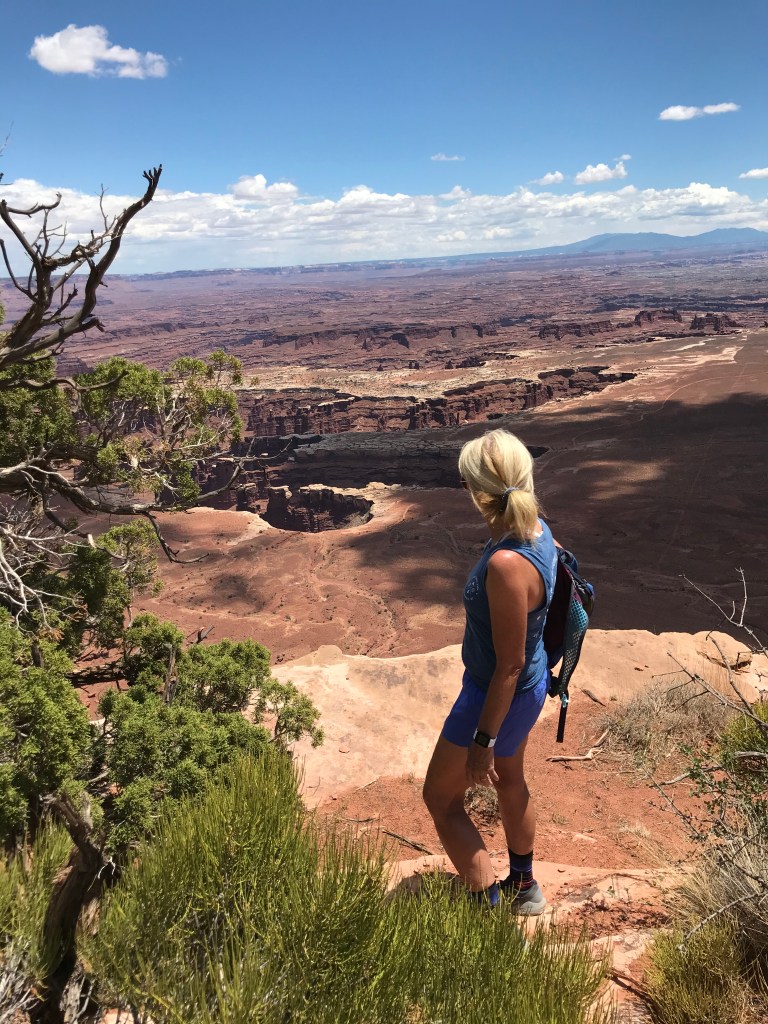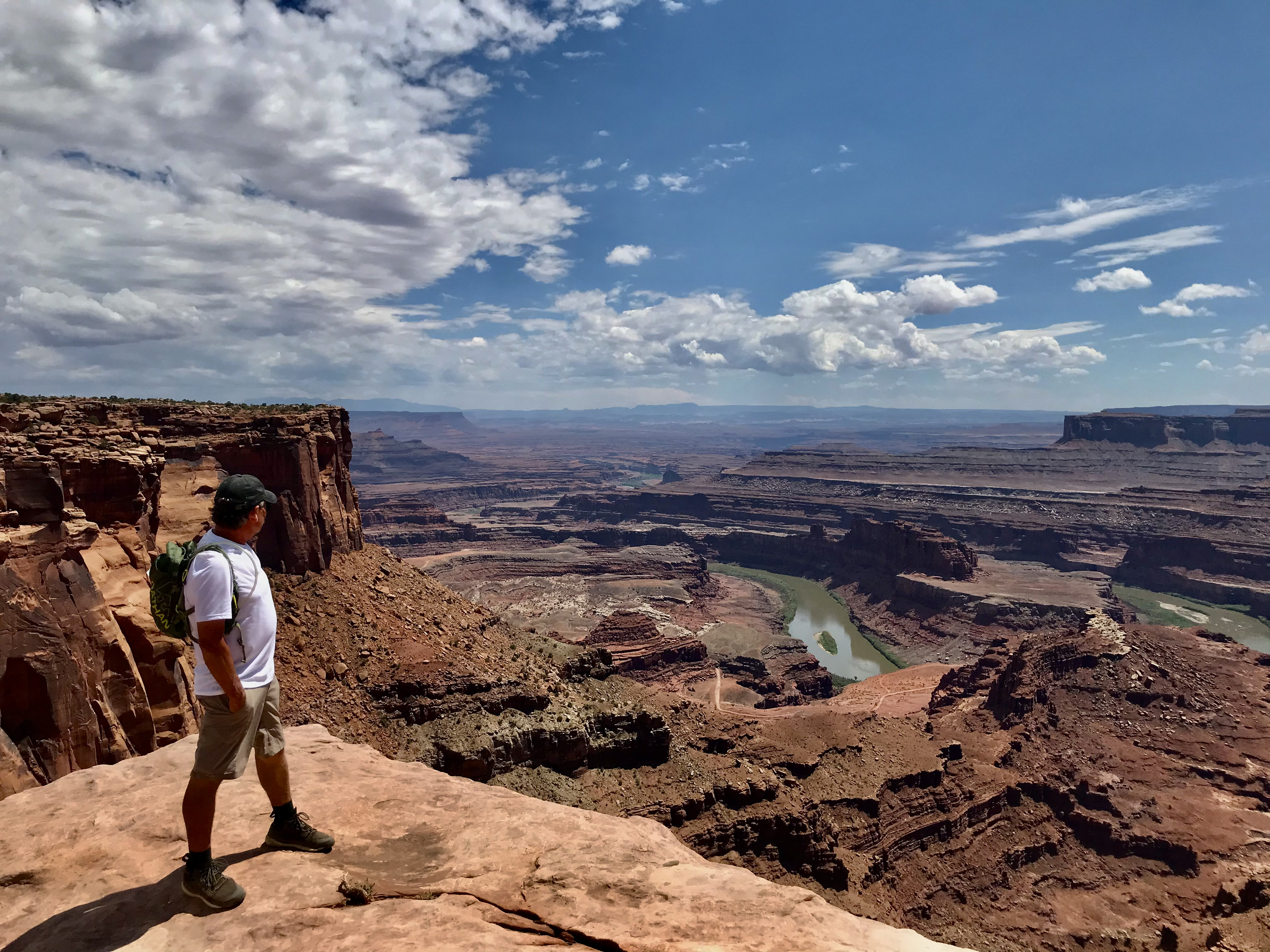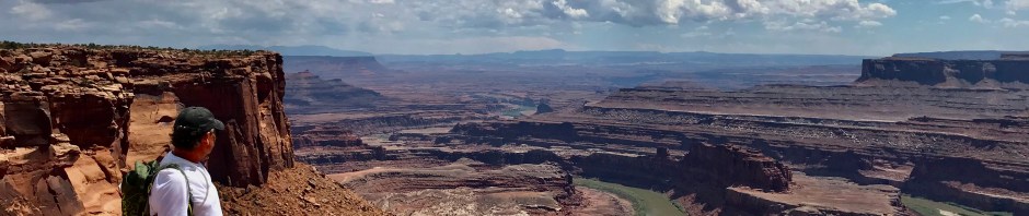 Our first stop is Dead Horse Point. I won’t tell the legend of Dead Horse Point but it worthy of reading on why it is named Dead Horse Point. We had planned on a ranger led full moon hike that evening only to discover that it has been canceled due to cloudy conditions. Dead Horse has separate trails for mountain bikers and hikers and is often a destination stop for those who mountain bike. The park is high desert on a plateau with scenic views of the Colorado River and reminds me of the Grand Canyon. We park at the Visitors’ Center and begin an 8+ mile loop hike with multiple side trails to multiple overlooks. The vast majority of our hike is alone without any others to be seen. We gain some 2500 feet elevation over the entire hike so it was a workout in the heat of the day but it was very special with some amazing views. The Big Horn Overlook side hike is not to be missed. All the overlooks are incredible with Dead Horse Point being the busiest due to the park road leading to the viewpoint.