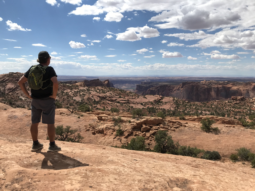 No time to rest and we head over to Upheaval Dome first and second overlooks. Another couple miles and several hundred feet of elevation with interesting views. We jump back in the car and drive over to Whale Rock where we get out and hike up a sandstone dome that looks like a whale for more panoramic views of Island in the Sky. Another mile and 130 feet elevation in the book.