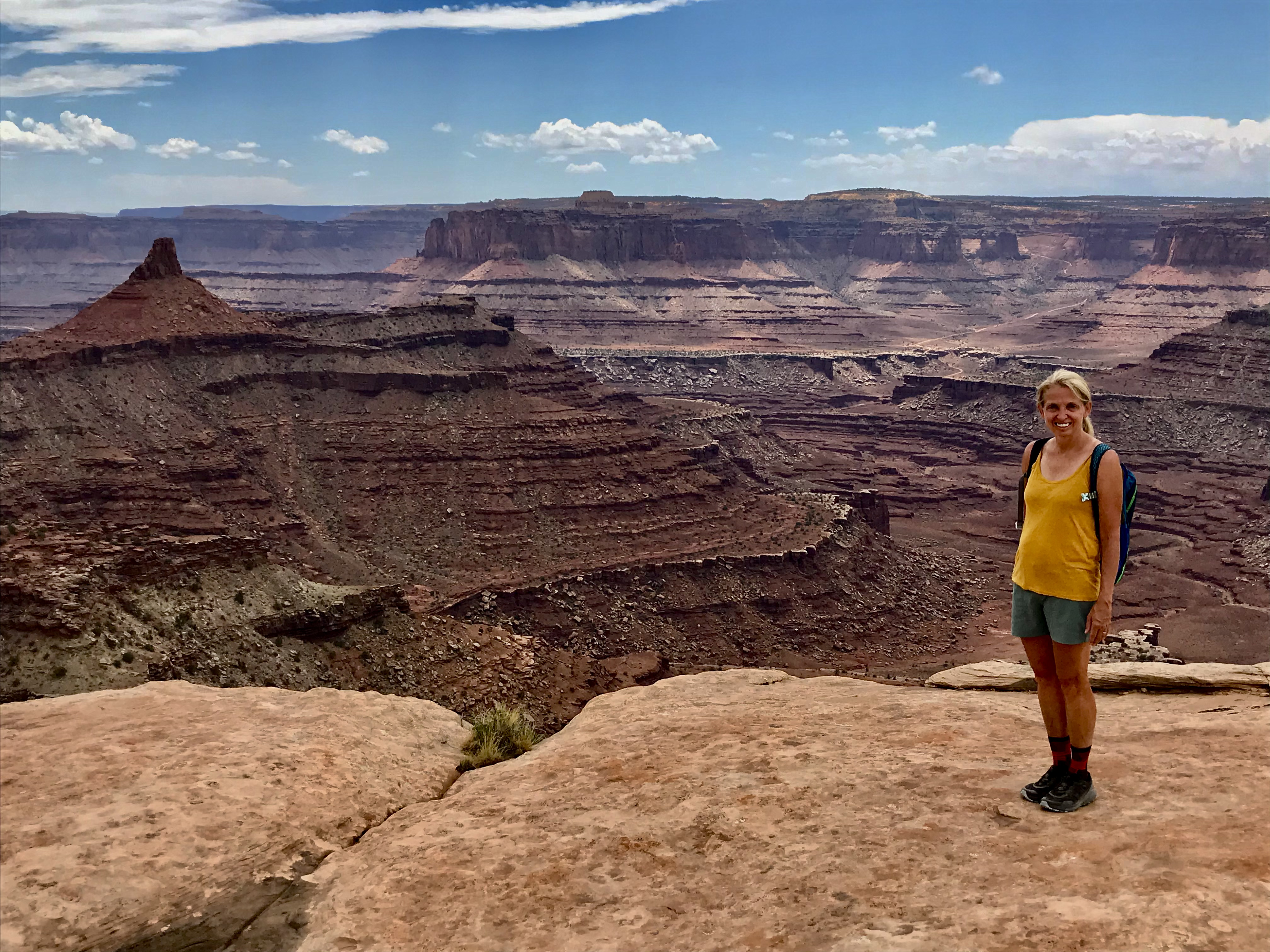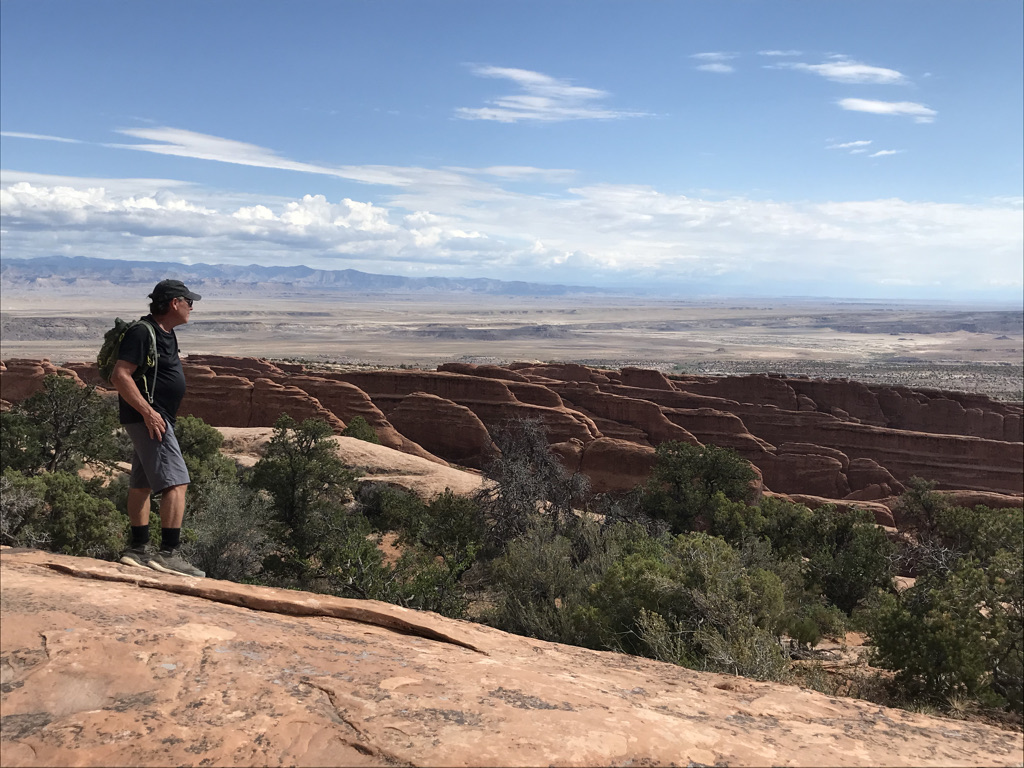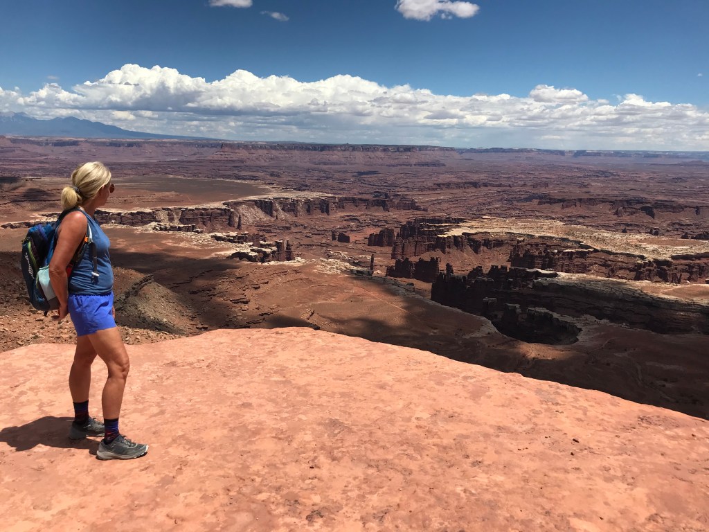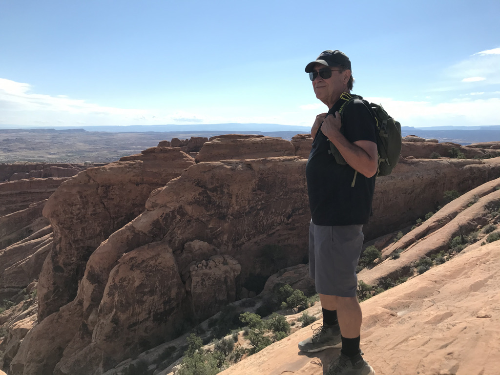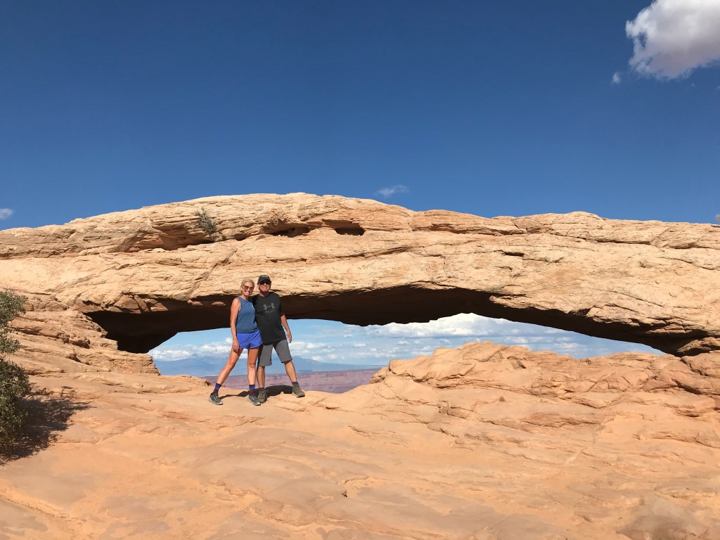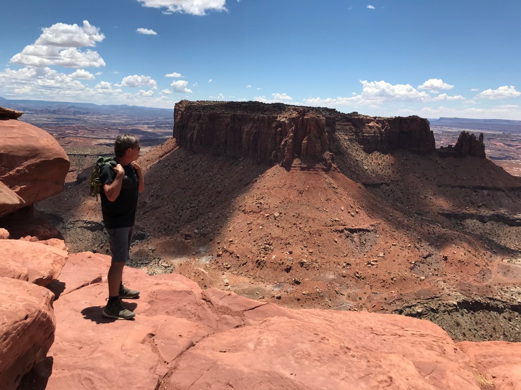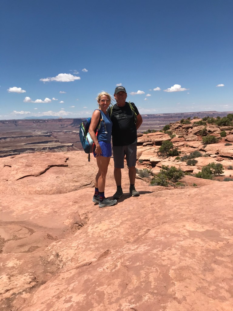 We travel over 30 miles NW of Moab to enter Canyonlands. The backup from the line of vehicles is over a mile long and I suppose I should expected there could be a wait. Our day is planned with multiple hikes and we start with Murphy’s Point. Murphy’s is a great way to start our day of hikes and the is 3.5 mile round trip hike leads us to some great views of the Green River and Candlestick Tower. Our elevation gains are 600+ feet. Very few on this trail and it is not difficult but the rewards are fabulous. We visit with several hikers at the overlook and manage to get our picture taken.