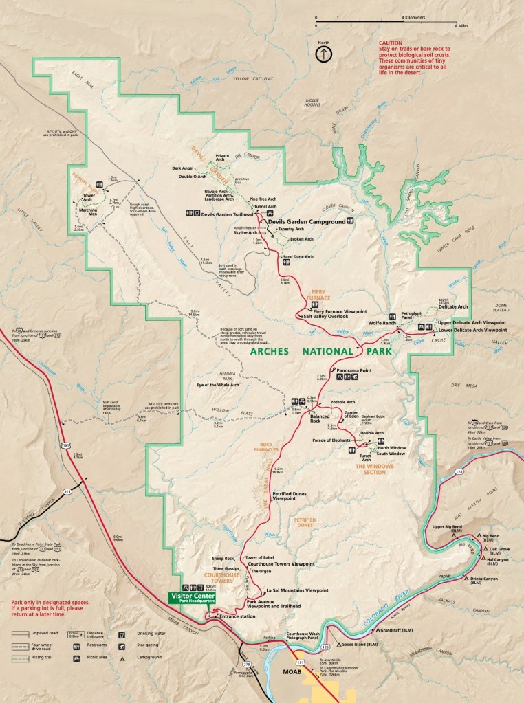 Dead Horse Point is located on the way to Canyonlands National Park so before returning to Moab for the evening we drive to the Visitors’ Center and get our tourist patches and a map for planning our upcoming hikes. We head to the Hoodoo Curio for some soaking in the jacuzzi before heading over to Moab Brewery. I have enjoyed some of Moab Brewery’s craft beers but must admit I was disappointed since the restaurant/brewery appears to be tired and in need of some upgrades. Of course the Dead Horse Ale is a must after being at the state park. We retire for the evening due to wanting to get to Arches before sunrise.